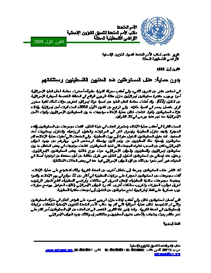 In the first 10 months of 2008, OCHA recorded 290 settler-related incidents targeting Palestinians and their property. This figure reflects a worrying trend, since it surpasses the total recorded by OCHA in each of the previous two years. Similarly, Palestinian deaths and injuries resulting from settler-related incidents in 2008 exceed the number of Palestinian casualties in each of the previous two years. Approximately half of all Palestinian injuries from settler violence each year since 2006 have been made up of children, women, and the elderly over 70 years of age.