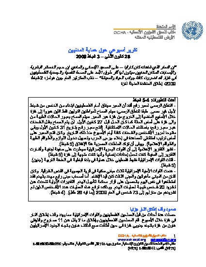 A number of incidents by Palestinian militants and Israeli forces undermined the cease-fire during the week. Electricity situation in the Gaza Strip improved, but thousands remain homeless. Access for NGOs remains difficult. Flash appeal for Gaza launched in Geneva. In the West Bank, there has been a noticeable increase in demolitions and displacement in the Jerusalem district. Also, new West Bank areas between the Barrier and the Green Line have been declared closed.