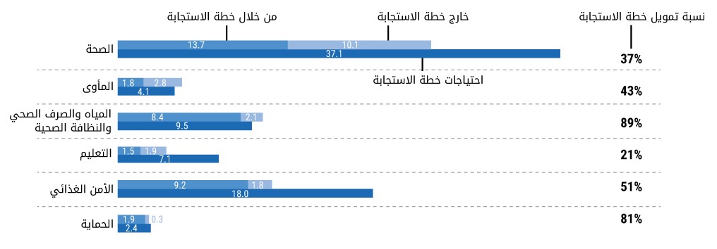 | احتياجات التمويل | من خلال خطة الاستجابة | النسبة المئوية المغطاة من خطة الاستجابة | خارج إطار خطة الاستجابة | مجموع التمويل المستلم |