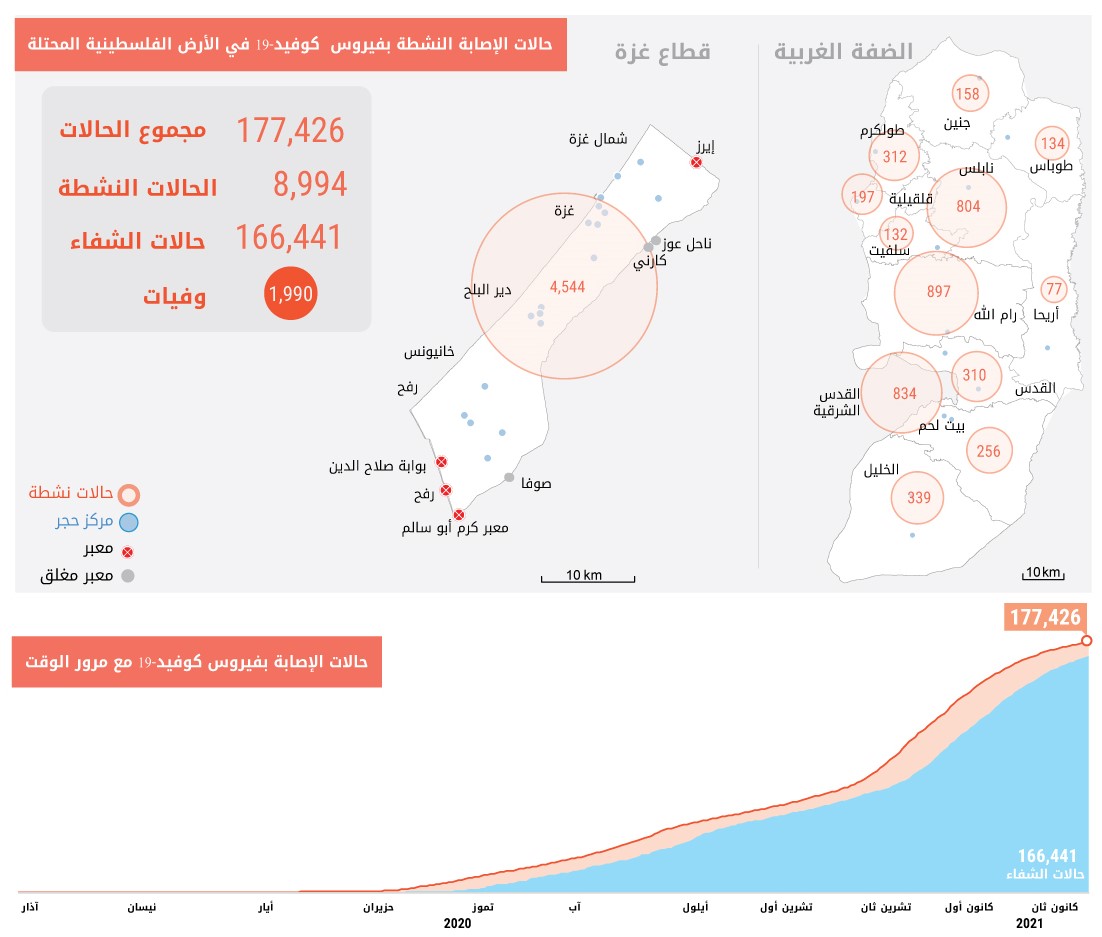 شهدت الفترة التي يغطيها هذا التقرير انخفاضًا نسبته 37 بالمائة في عدد الحالات النشطة المصابة بفيروس كورونا في الأرض الفلسطينية المحتلة، حيث أثبتت الفحوصات إصابة 8,810 فلسطينيين آخرين بالفيروس وتعافي 13,957 شخصًا منه، وفقًا لوزارة الصحة الفلسطينية. وبلغ عدد الحالات التراكمية 177,426 حالة، وتعافى 166,441 شخصًا من إصابتهم بالفيروس. ولا يزال عدد المرضى الموجودين في وحدات العناية المركزة يشهد تراجعًا، حيث انخفض من 93 مريضًا في نهاية فترة التقرير السابق إلى 64 مريضًا، بمن فيهم أولئك الذين تستدعي حالتهم ربطهم بأجهزة التنفس الصناعي، والذين تناقص عددهم من 25 إلى 18 مريضًا.