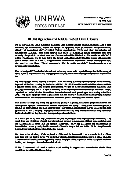 Press Release: 18 UN Agencies and NGOs Protest Gaza Closure