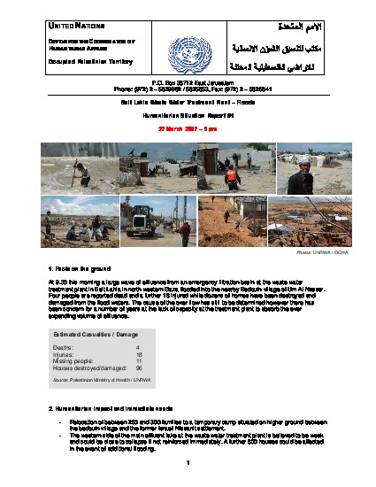 At 9.30 this morning a large wave of effluence from an emergency filtration basin at the waste water treatment plant in Beit Lahia in north western Gaza flooded into the nearby Bedouin village of Um Al Nasser. Four people are reported dead and a further 18 injured while dozens of homes have been destroyed and damaged from the flood waters.