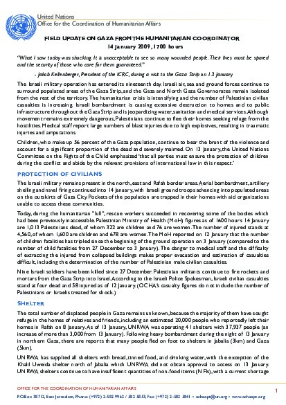 OCHA humanitarian update on Gaza crisis, 14 January. This report focuses on the humanitarian situation - casualties, food, health, shelter, water and sanitation, electricity and fuel, access and crossings as well as priority needs.