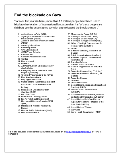 For over five years in Gaza, more than 1.6 million people have been under blockade in violation of international law. More than half of these people are children. Fifty international humanitarian and human rights organizations say with one voice: end the blockade now.