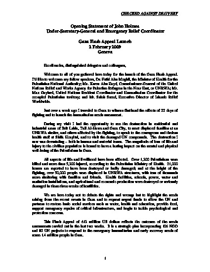 Gaza Flash Appeal Launch: Opening Statement of John Holmes, ERC and USG