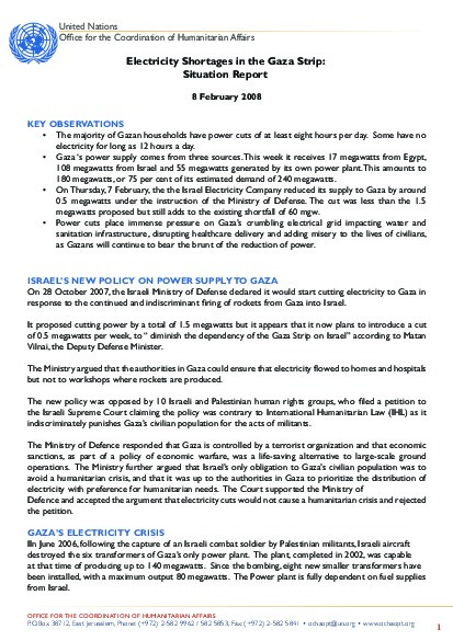 The majority of Gazan households have power cuts of at least eight hours per day. Gaza ?s power supply comes from three sources. This week it receives 17 megawatts from Egypt, 108 megawatts from Israel and 55 megawatts generated by its own power plant. This amounts to 75 per cent of its estimated demand of 240 megawatts.