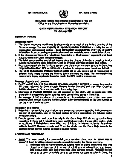 The Gazan economy continues to deteriorate as a result of the limited opening of the Gazan crossings. If the closures continue, it is expected that at least 120,000 workers in Gaza will lose their jobs.