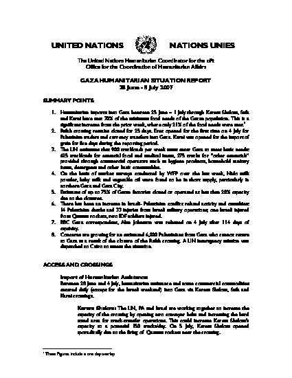 Weekly humanitarian imports into Gaza meeting 70% of the minimum food needs | Erez opened for Palestinian traders | Karni opened for grain | UN estimates 900 truckloads | week to meet basic needs. Increase in Israeli - Palestinian conflict casualties | BBC Gaza correspondent, Alan Johnston released