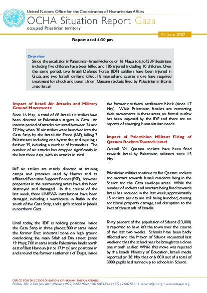 Since the escalation in Palestinian-Israeli violence on 16 May, a total of 53 Palestinians including five children have been killed and 185 injured including 10 children. Over the same period, two Israeli Defence Force (IDF) soldiers have been injured in Gaza, and two Israeli civilians killed, 18 injured and scores more have required treatment for shock and trauma from Qassam rockets fired by Palestinian militants into Israel