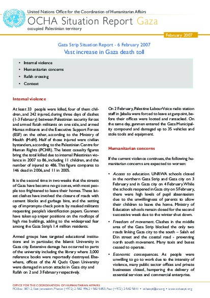 The ceasefire between Palestinian factions announced by Palestinian Foreign Minister in the early hours of this morning is holding. The ceasefire follows the heaviest loss of life from inter-factional fighting recorded by OCHA with at least 34 deaths and 133 injuries between the evening of 25 January and the evening of 29 January.