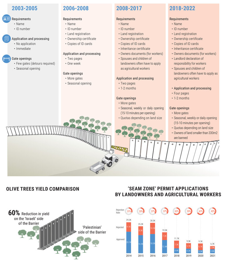 Between 2014 and 2021, the number of permits requested by landowners and agricultural workers dropped by 77 per cent. This drop is largely attributed to the high rejection rates of permit applications, cumbersome application procedures, the issuance of permits for short periods, and limited gate opening times amongst other factors. The limitations in accessing land has resulted in a 60 per cent reduction in yield in land beyond the barrier.