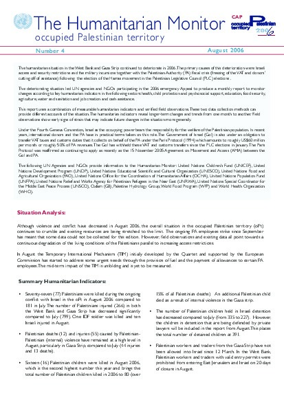 This monthly UN report monitors of situation and changes using humanitarian indicators in sectors such as health, employment and the protection of civilians. Report uses both measurable humanitarian indicators and verified field observations.