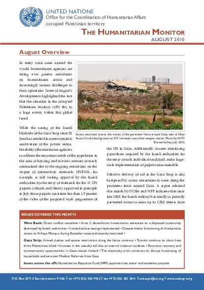 While the easing of the Israeli blockade of the Gaza Strip since 20 June has resulted in some economic reactivation of the private sector, the ability of humanitarian agencies to address the enormous needs of the population in the area of housing and services remains severely constrained due to the ongoing restrictions on the import of construction materials.