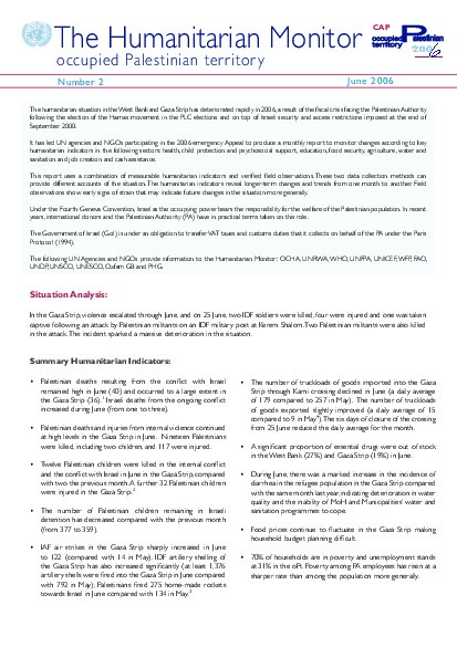 This monthly UN report monitors of situation and changes using humanitarian indicators in sectors such as health, employment and the protection of civilians. Report uses both measurable humanitarian indicators and verified field observations.