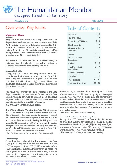 This report uses a combination of measurable humanitarian indicators, verified field observations and sector-based reports to monitor the humanitarian situation in the OPT. The May report highlights an update on the Gaza Strip, the wave of "stop work" orders in the southern West Bank and the most recent findings on food security in the OPT, among other issues covered.