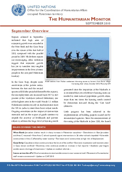 Reports released in September indicated that high rates of economic growth were recorded in the West Bank and the Gaza Strip over the course of the first half of 2010, compared with the parallel period in 2009. While these reports are encouraging, other indicators suggest that economic growth has yet to translate into tangible improvements in the lives of many people in the occupied Palestinian territory.