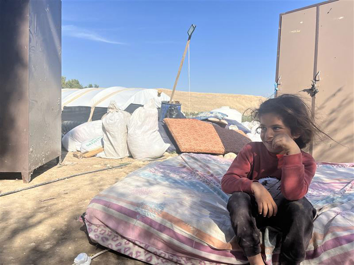 A Palestinian girl sits on a mattress in the open in the Jordan Valley in early February, as her family dismantles their belongings during displacement following repeated settler attacks, which forced nearly 60 community members to flee. Photo by OCHA