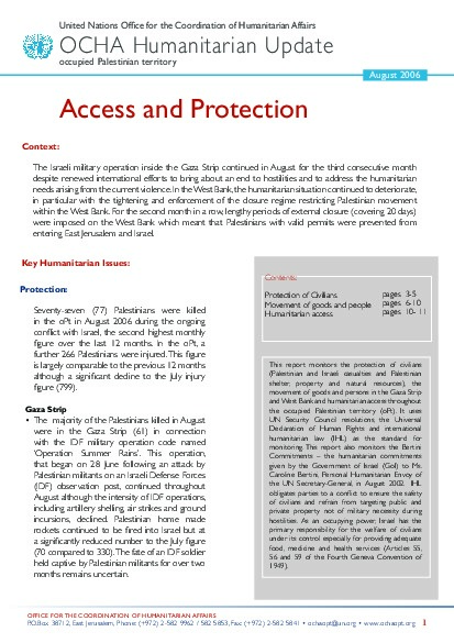The Israeli military operation inside the Gaza Strip continued in August for the third consecutive month despite renewed international efforts to bring about an end to hostilities and to address the humanitarian needs arising from the current violence.