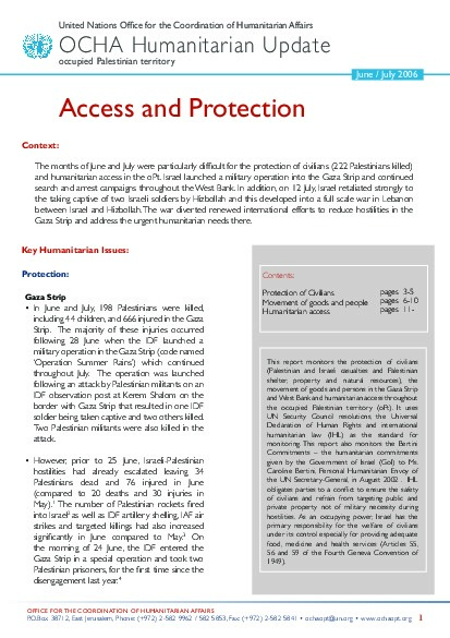The months of June and July were particularly difficult for the protection of civilians (222 Palestinians killed) and humanitarian access in the OPT. Israel launched a military operation into the Gaza Strip and search and arrest campaigns continued throughout the West Bank.