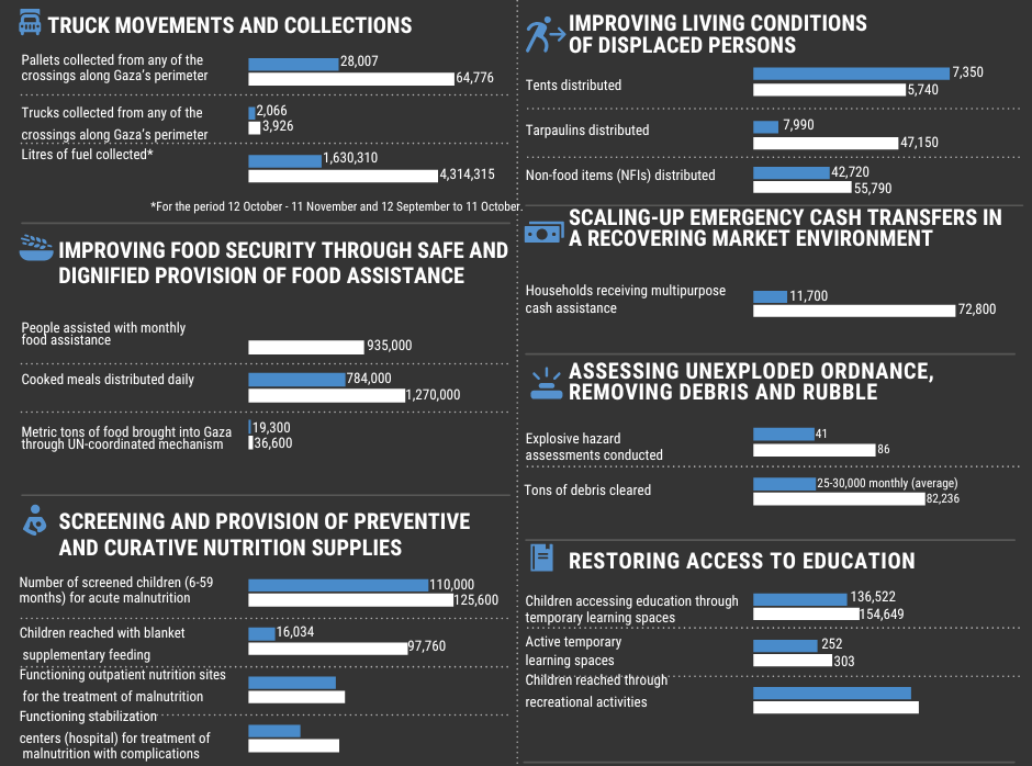 Note: This report outlines efforts and progress made by the UN and its partners to scale up humanitarian response across the Gaza Strip under the ceasefire that entered into effect on 10 October 2025. Figures refer to UN and partner assistance dispatched through the UN-coordinated system. Unless when noted otherwise, the report does not cover supplies entering through bilateral donations or the commercial sector.