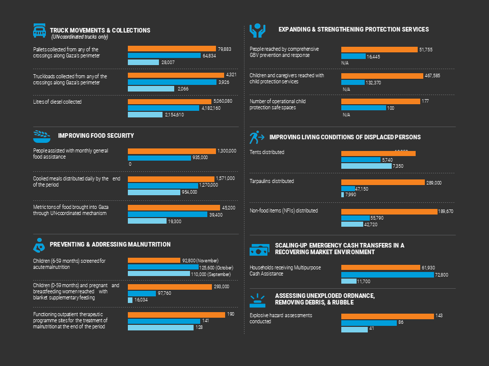 Note: This report outlines efforts and progress made by the UN and its partners to scale up humanitarian response across the Gaza Strip under the ceasefire that entered into effect on 10 October 2025. Figures refer to UN and partner assistance dispatched through the UN-coordinated system. Unless when noted otherwise, the report does not cover supplies entering through bilateral donations or the commercial sector.