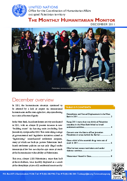 2011 was characterized by a lack of respect for IHL and IHR. Israeli settlement activity accelerated, with an almost 20% increase in new ‘starts’ for housing units, compared to 2010. Almost 1,100 Palestinians were forcibly displaced as a result of the demolition of over 620 structures. Two thirds of all Palestinian casualties in WB occurred in the context of attacks by Israeli settlers or during clashes with Israeli forces at demonstrations protesting settlement takeover of land. As in past years, restricted access to land in the vicinity of settlements, along with Israeli settler violence, were among the key factors undermining the olive harvest. In Gaza, 1/3 of essential drugs and 20% medical supplies are at zero stock.