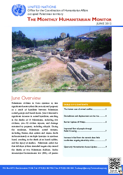 Palestinian civilians in Gaza continue to face significant threats to their life, security and property as a result of hostilities between Palestinian armed groups and Israeli forces, which resulted in 15 killed and over 50 civilians injured, and damage to a number of structures, including two schools. There is improvement of access of Gazans to outside world through Rafah border crossing. In the West Bank, the forced displacement of Palestinians continued in June, due to the Israeli authorities’ demolition of Palestinian-owned structures lacking Israeli-issued building permits.