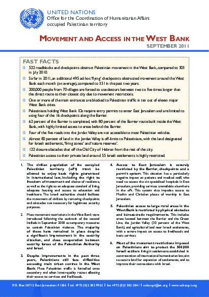 Despite some improvement in the movement of Palestinian between the main West Bank urban centers in recent years, the system of restrictions implemented by the Israeli authorities continues to hinder the access to livelihoods and basic services, including health, education and water supply. There are currently some 70 villages and communities, with a combined population of over 200,000, compelled to use detours that are between two to five times longer than the direct route to the closest city, undermining access to basic services. Some of the main traffic arteries have been transformed into rapid corridors used by Israeli citizens to commute between the settlements and Israel, and, in some cases, between various areas within Israel via the West Bank.