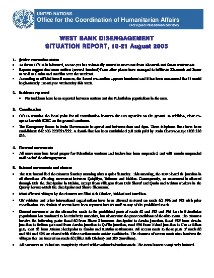 Northern West Bank Disengagement - Situation Report No. 1 | 16 Aug 2005