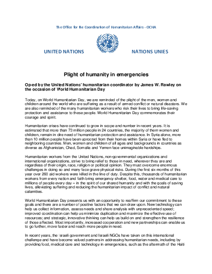 Op-ed by the United Nations humanitarian coordinator by James W. Rawley on the occasion of World Humanitarian Day