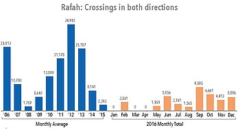 The Rafah Crossing with Egypt, which until recent years was the main crossing point used by Palestinians in Gaza given the broad restrictions on the Israeli-controlled crossings, has been largely closed including for humanitarian assistance since 24 October 2014. Rafah opened on a partial basis for 44 days in 2016 compared to 32 days in 2015. Some 42,200 crossed in both directions compared to 28,700 in 2015, an increase of 47 per cent: in 2013, the figure was approximately 300,000. Even when operational, procedures regarding the opening times and the permitted categories are unpredictable: on occasion, only pilgrims have been permitted to exit or return. In 2016, only 1,713 patients were permitted by the Egyptian authorities to travel to Egypt for health care on the 38 days it was open for patients. Prior to the 2014 closure, more than 4,000 residents from Gaza crossed to Egypt monthly for health-related reasons. Over 20,000 people, including humanitarian cases, are pre-registered to cross Rafah, according to the Palestinian authorities in Gaza.