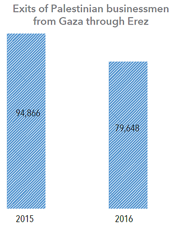 This downward trend was particularly pronounced for businesspeople, with this category witnessing a 20 per cent decline in the number of crossings in 2016 compared to the previous year.[9] Restrictions were also increased on senior businesspeople who hold businessmen Gaza permits “BMG”, which is intended to facilitate easier access compared to the normal permit.[10]
