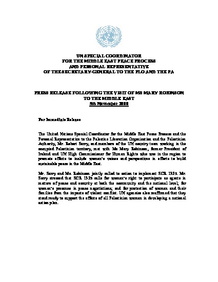 The United Nations Special Coordinator for the Middle East Peace Process and the Personal Representative to the Palestine Liberation Organization and the Palestinian Authority, Mr. Robert Serry, and members of the UN country team working in the occupied Palestinian territory, met with Ms Mary Robinson, former President of Ireland and UN High Commissioner for Human Rights who was in the region to promote efforts to include women’s voices and perspectives in efforts to build sustainable peace in the Middle East.