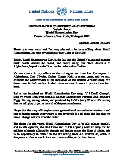 Today, World Humanitarian Day, is the day that the United Nations and partners mark events around the world, and we’re doing that from Australia to Afghanistan, in parks and offices, on the radio and on Twitter. It’s our chance to pay tribute to the colleagues we have lost. Colleagues in Afghanistan, Cote d’Ivoire, Sudan, Congo, Haiti in recent years, and we also celebrate the achievements of the thousands of aid workers at work today. We thank them for their service. And of course we must do more to protect them from harm.