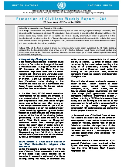 Israeli military incursions and Palestinian rocket and mortar fire continued throughout the week in the Gaza Strip. In the West Bank, 67 IDF search operations were reported with 95 Palestinians arrested. Sharp increase in Israeli settler violence in the West Bank—Muslim religious sites desecrated. Gaza Strip: 1.5 million people continue experiencing electricity cuts. Humanitarian aid and commercial imports severely curtailed- 11 Trucks/day average
