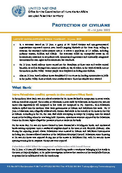 Intra-Palestinian violence increased in the southern West Bank Governorates of Hebron and Bethlehem this week. Eight Palestinians, including three children, were injured by Israeli forces in the West Bank in various types of incidents. Huwwara checkpoint is now open for all Nablus city residents to enter and exit Nablus without permits, and most infrastructure at the Jericho DCO checkpoint at the southern entrance to Jericho City was removed. Two Palestinian families demolished adjoining structures to their homes in the Old City of Jerusalem. The Jerusalem municipality, distributed 20 demolition orders in Al Bustan neighborhood of Silwan in East Jerusalem. On 15 June, Israeli military forces, accompanied by representatives of the Israeli Civil Administration, issued orders to a farmer from Khirbet Tuwayil, in the Nablus Governorate, east of 'Aqraba village, for the immediate removal of two structures, First cases of H1N1 flu reported in the West Bank.