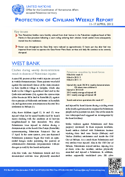 Israeli forces injure 40 Palestinians in the West Bank; a farmer was also injured in the Gaza Strip. Also in the West Bank, Settlers injure four Palestinians and vandalize over 250 olive trees. Israeli authorities forcibly evict Palestinian families from their homes in East Jerusalem, and demolish 25 Palestinian-owned structures in Area C. In Gaza, power cuts of 12 hours per day continue to disrupt delivery of services and daily life.