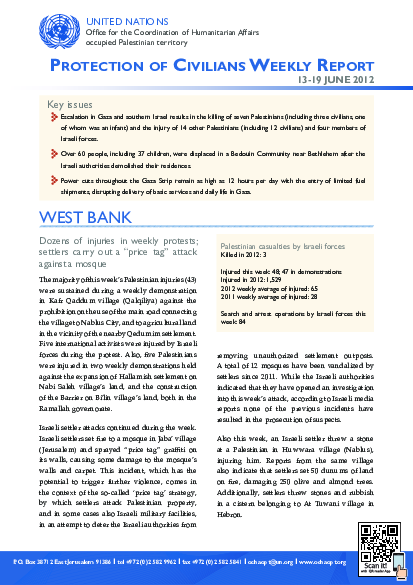 Escalation in Gaza and southern Israel results in the killing of seven Palestinians and the injury of 14 others. Two Palestinians killed by an Israeli truck driver this week. Israeli forces injure 48 Palestinians throughout the West Bank. Settlers set fire to a mosque in the context of "price tag" strategy. Israeli authorities demolish 26 Palestinian-owned structures, displacing over 60 people. In Gaza, one worker killed in a tunnel-related incident. Electricity cuts remain as high as 12 hours per day.