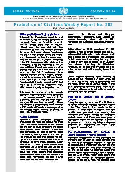 This week, two Palestinians were killed and six injured during IDF military operations in the West Bank. Throughout the West Bank, skirmishes between Israeli settlers and Palestinian olive harvesters broke out when settlers either attacked Palestinian olive harvesters, or tried to prevent them from reaching their agricultural land. On 15 - 21 October, the Israeli Authorities imposed a general closure in the West Bank for the Jewish holiday of Sukkoth.
