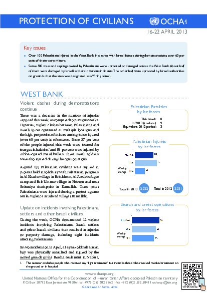 Over 100 Palestinians injured in the West Bank in clashes with Israeli forces during demonstrations; over 60 per cent of them were minors.