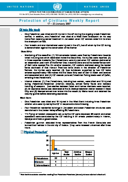 One Palestinian was killed and 22 injured in the ongoing Israeli-Palestinian conflict. Four Israelis and one international were injured, two of them by the IDF.