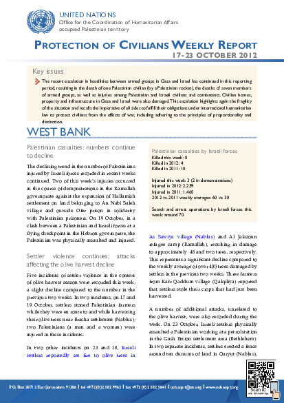 This weeks escalation in Gaza and southern Israel results in the death of six Palestinians and the injury of eight other Palestinians and three Israelis. In the West Bank, Israeli settlers injure three Palestinians and damage around 50 olive trees. Israeli authorities demolish three Palestinian-owned structures. Also in Gaza, the transfer of Qatar fuel resumed and six truckloads of date bars exited to the West Bank.