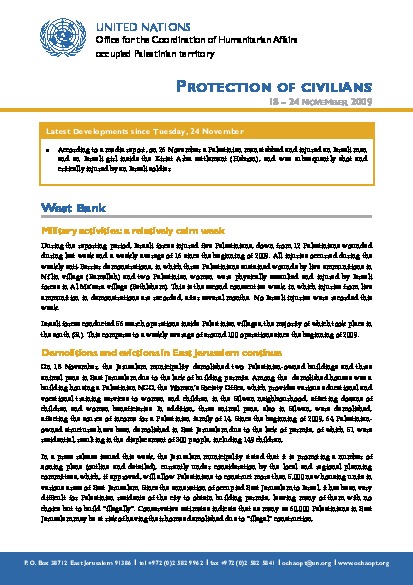 This week, ten Palestinians were wounded by Israeli forces throughout the oPt. Demolitions and evictions in East Jerusalem continue. Demolition and stop work orders delivered in Area C. There were six settler-related incidents affecting Palestinians; two Palestinians injured. In Gaza, increase in Israeli airstrikes led to the injury of five Palestinians. 750 students at risk of losing the academic year. Despite increase in cooking gas, shortages continue. Imports remain below average needs.
