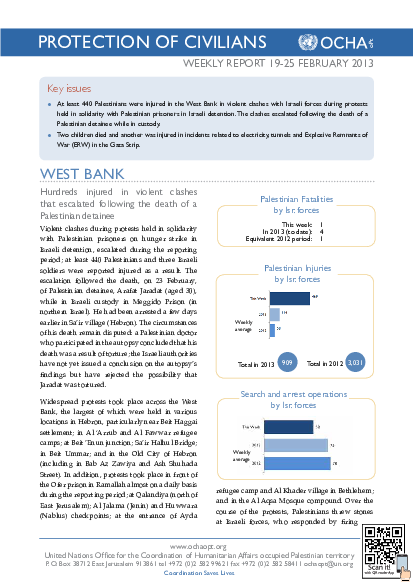 At least 440 Palestinians were injured in the West Bank in violent clashes with Israeli forces during protests held in solidarity with Palestinian prisoners in Israeli detention. The clashes escalated following the death of a Palestinian detainee while in custody. Also in the West Bank, At least 28 Palestinians and 12 Israeli settlers were injured this week in the context of settler attacks. Two children died and another injured in incidents related to electricity, tunnels and Explosive Remnants of War (ERW) in the Gaza Strip.