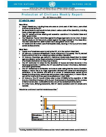 Eleven Palestinians, including three who were on picnic east of Beit Hanun, were killed and five injured in the Gaza Strip. The IDF distributed 12 orders for the demolition of houses and other structures in the Qalqiliya governorate. The IDF issued military order number (T/183/5) for the requisition of 766 dunums of land in Hebron governorate.