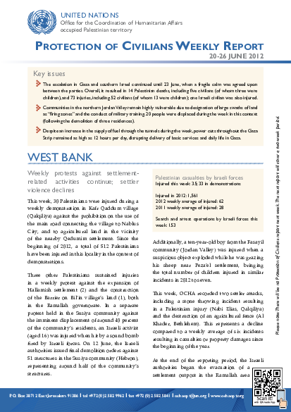 The escalation in Gaza and southern Israel between 17 and 23 June results in 14 Palestinian deaths and over 70 injuries (This week alone, seven Palestinians died and 57 others injured). In the West Bank, Israeli forces injure 35 Palestinians mainly in the course of demonstrations. Also, 15 Palestinians-owned structures demolished by Israeli authorities, mainly in a Bedouin community in the Jordan Valley. Other communities are being affected by military training exercises conducted by Israeli forces in the vicinity. Also in Gaza, power cuts remain as high as 12 hours per day.