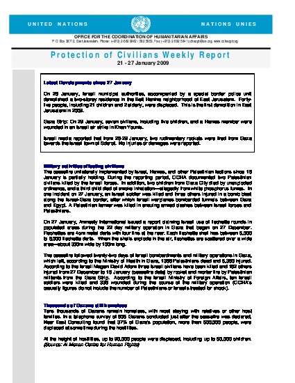The cease-fire unilaterally implemented by Israel, Hamas, and other Palestinian factions since 18 January is partially holding. Tens thousands of Gazans remain homeless, with most staying with relatives or other host families. Gaza water and sanitation conditions, which had severely deteriorated during the Israeli offensive, have somewhat improved. As a whole, the population of Gaza is receiving approximately 84% of its electricity needs. NGOs continued to face difficulty accessing the Gaza Strip to carryout humanitarian work. The higher numbers of truckloads entering Gaza since 28 December 2008 continued during the reporting period. Protests against the Barrier and the Israeli Gaza offensive continued in the West Bank villages of Ni'lin, Bil'in (Ramallah), Jayyus (Qalqiliya) and Ma'sara (Bethlehem). In northern West Bank, Israeli authorities renewed the orders issued for requisitioning the land on which the Barrier was built.