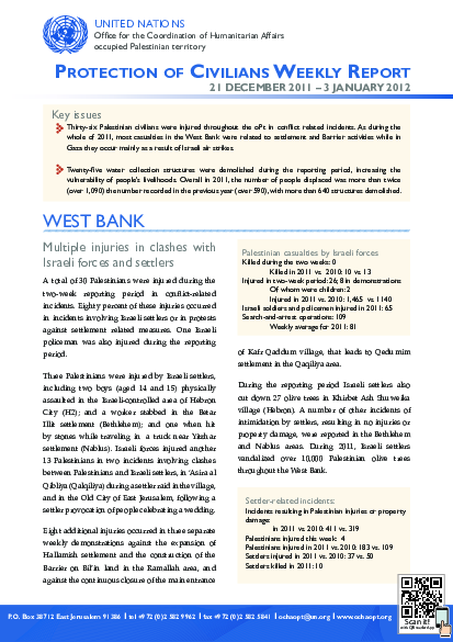 During the two-week reporting period, Israeli forces kill two Palestinians in Gaza and injure dozens throughout the OPT. In the West Bank, another four Palestinians injured by settlers. The Israeli authorities demolished 40 Palestinian-owned structures, the majority of which were water-related structures. Also in Gaza, the Israeli authorities bulldozed some of the remaining infrastructure at Karni commercial crossing. Limited agricultural produce continue to be allowed out of Gaza.