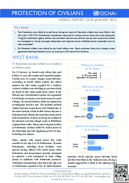 Two Palestinians were killed by Israeli forces during the week; six Palestinian civilians have been killed in the OPT so far in 2013.Six Palestinian civilians were injured by the Israeli military near Gaza’s perimeter fence; this is despite recent agreements allowing Palestinian access to areas up to 100 meters from the fence.