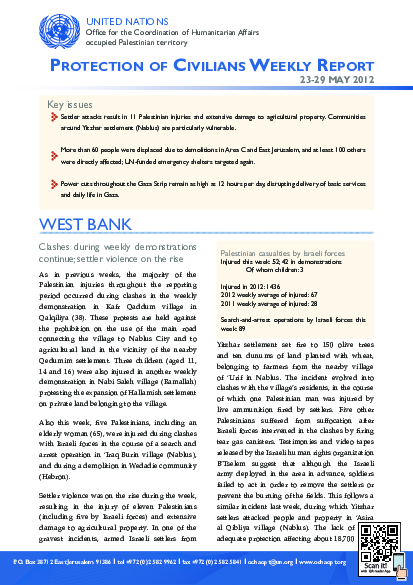 Israeli forces injure over 50 Palestinians in the West Bank and another one near the fence in Gaza. Settlers injure seven Palestinians and damage at least 150 olive trees. Also in the West Bank, Israeli authorities demolish 17 Palestinian-owned structures, including seven residences, displacing over 60 people; another two residential structures demolished by their owners. In Gaza, concerns over shortages of power and fuel continue.